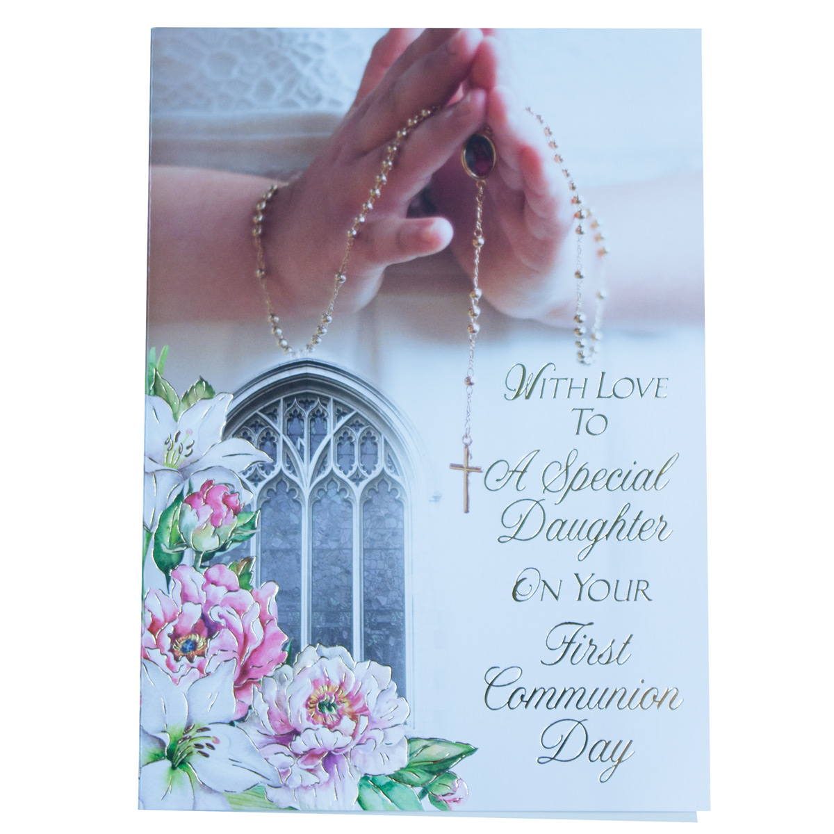 Lovely mum/dad to daughter card with gold colour writing, rosary and flowers.