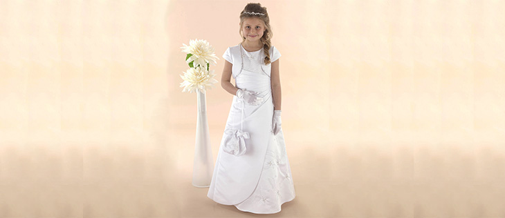 The veils and head dresses which we stock are conservative and appropriate, but nonetheless charming. They can be topped with another hair accessory, such as a small tiara or, alternatively, a white headband. Other accessories we sell include small handbags, gloves, shoes, socks and tights- everything your daughter will need to look perfect.